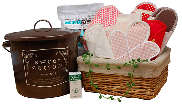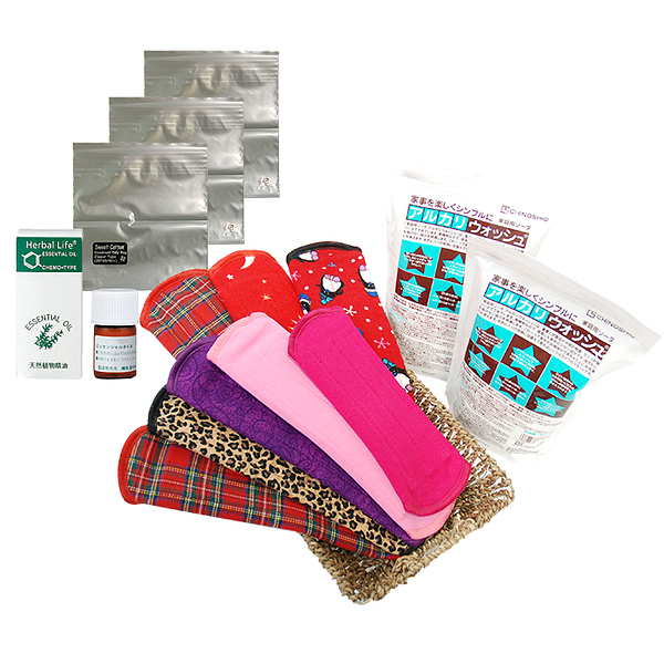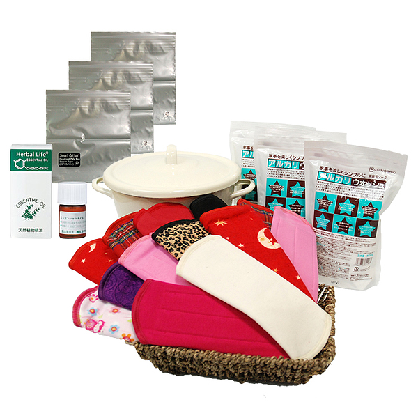 つけ置きに便利なホーローポットと経血を簡単に落としてくれるアルカリウォッシュ500g、お洗濯を楽しくさせるティーツリーオイル、外出先で便利な防臭チャック袋がついていて布ナプ生活を充実させてくれるセットです。
